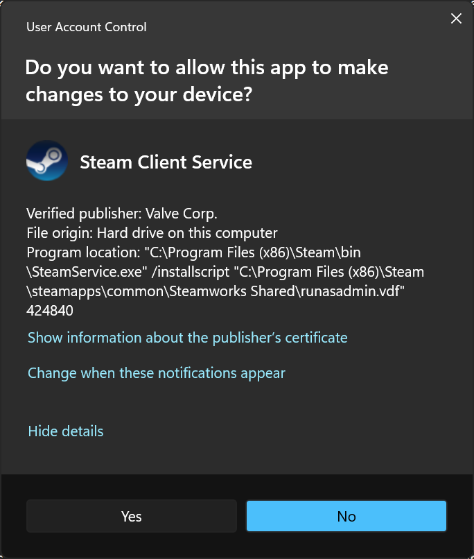 Sometimes when you launch a Steam game, there will be a User Account Control prompt from Windows asking about Steam Client Service. This is to install any prerequisites such as Visual C++ or DirectX (why are these not preinstalled on Windows 11 already)
